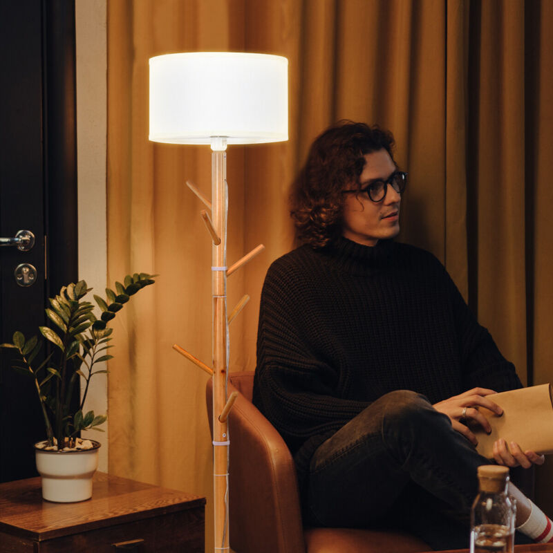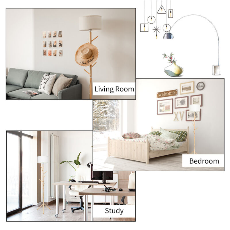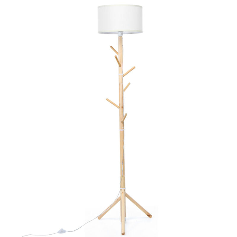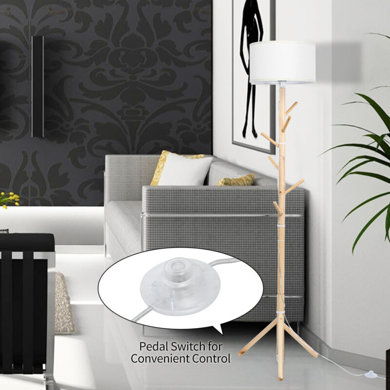 Wood Floor Light Standing Lamp 6 Hooks Coat Rack 3 Positions Height Adjutable