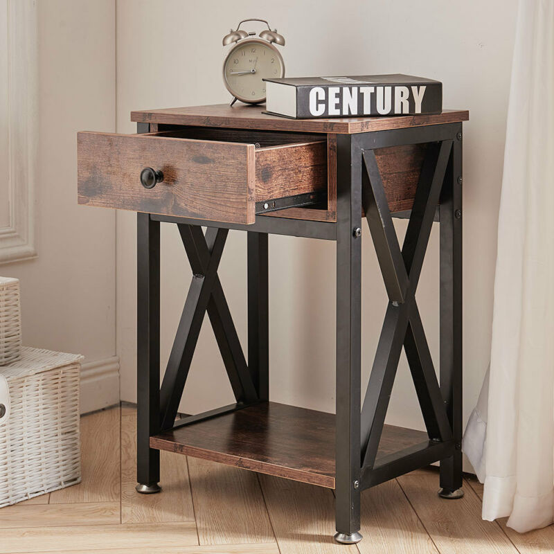Wooden Bedside Table Cabinet Industrial 1-Drawer Side Table Nightstand Steel Leg