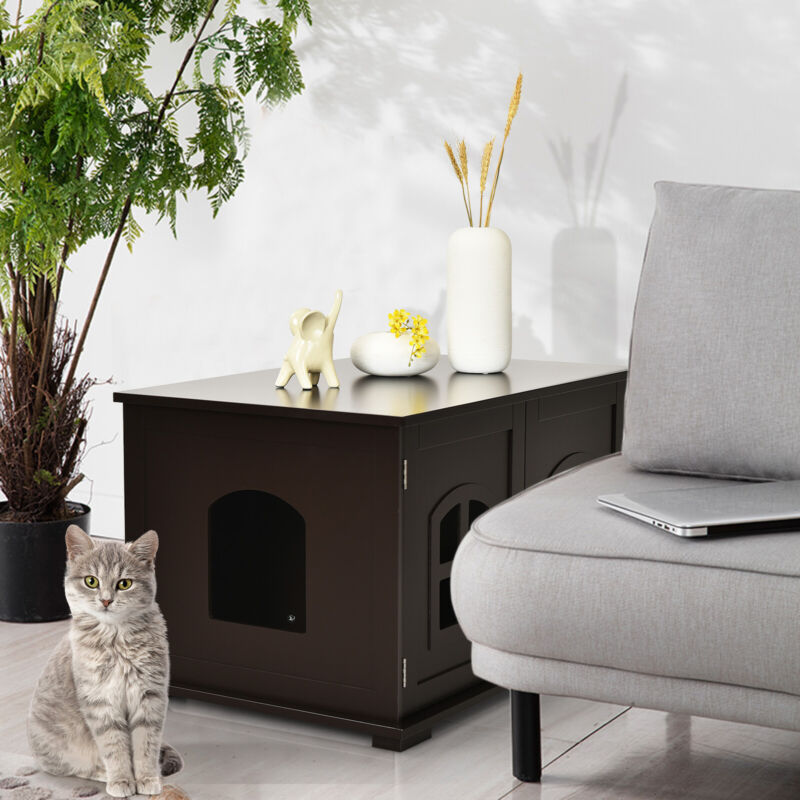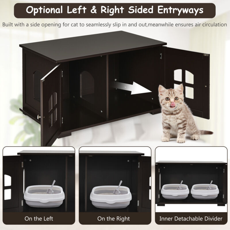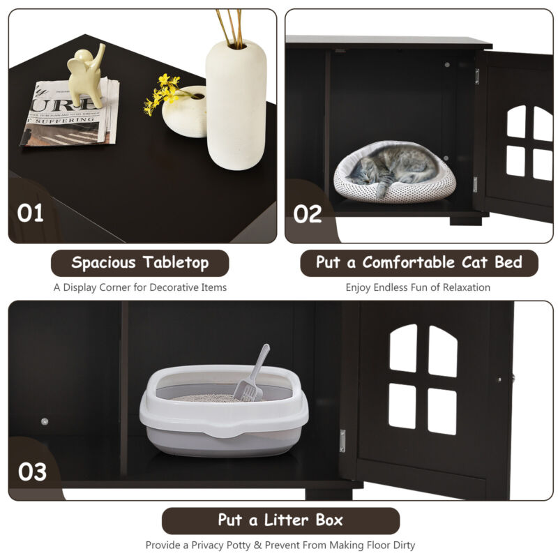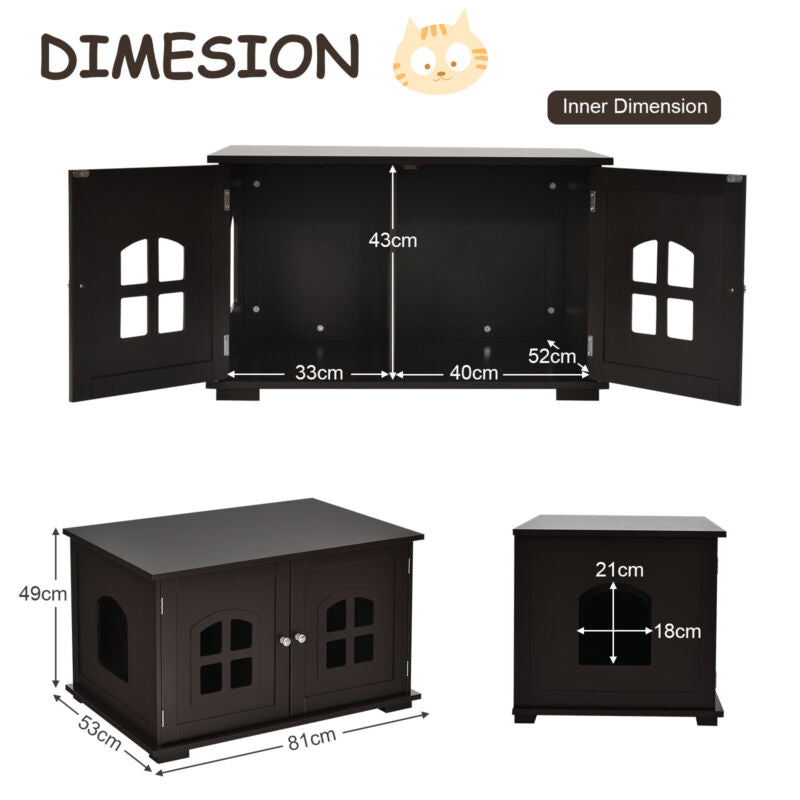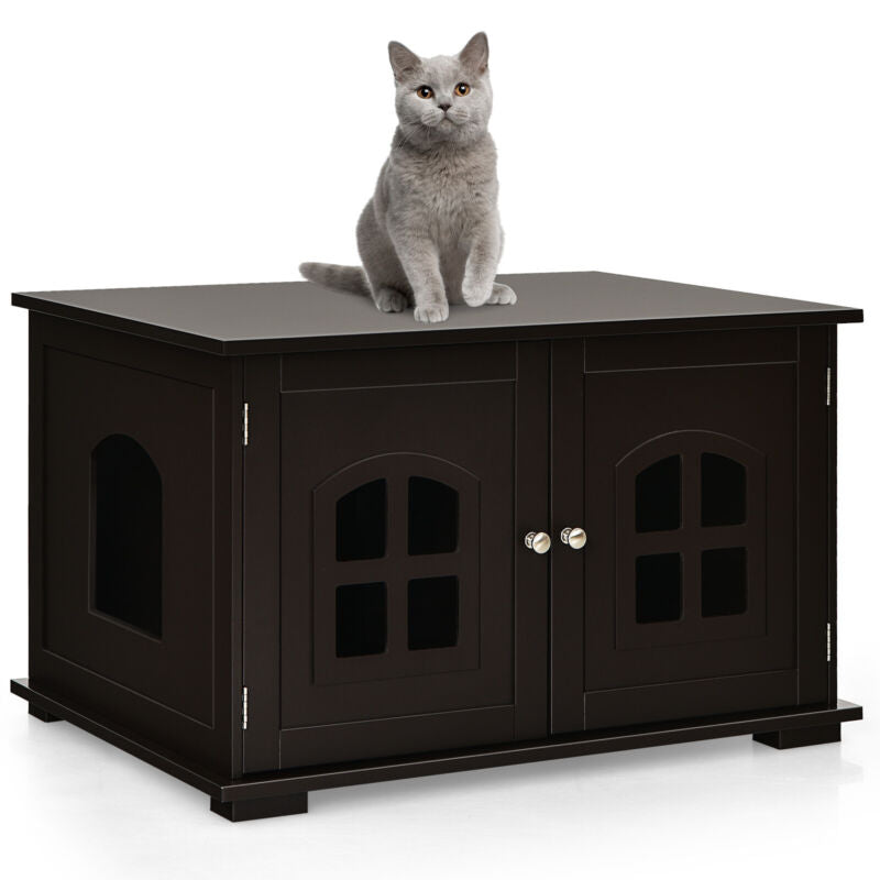Wooden Cat Litter Box Enclosure Kitty Washroom Toilet Storage Cabinet W/ Window