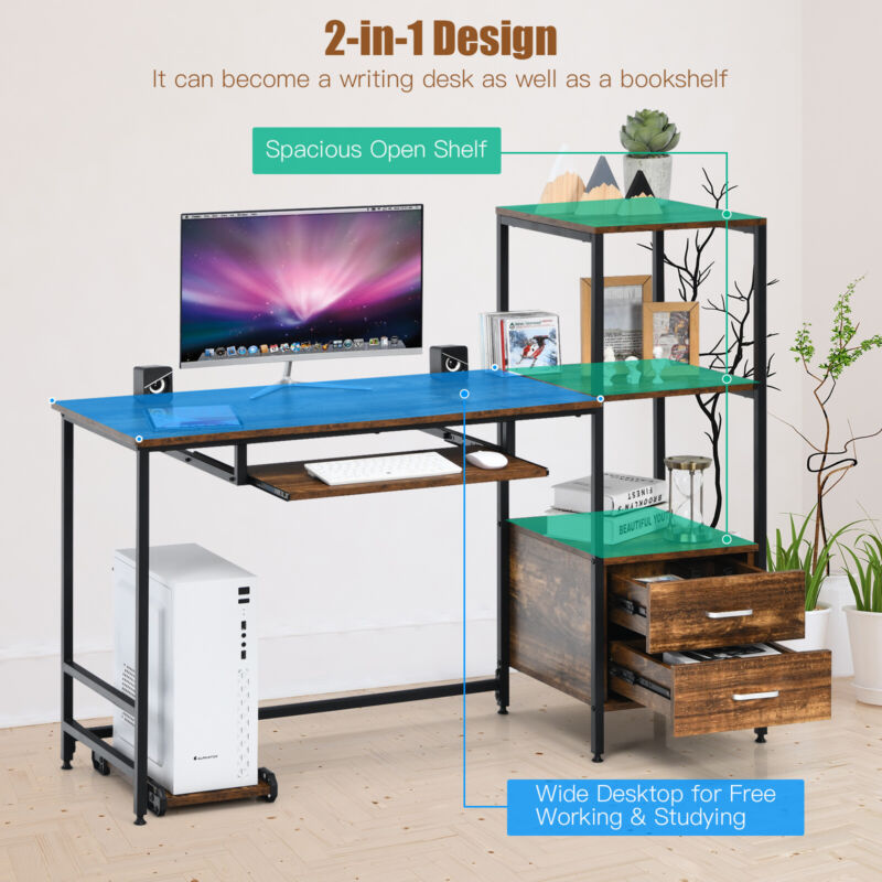 Wooden Computer Desk 3-Tier Shelves Computer Workstation W/ CPU Stand & Drawer