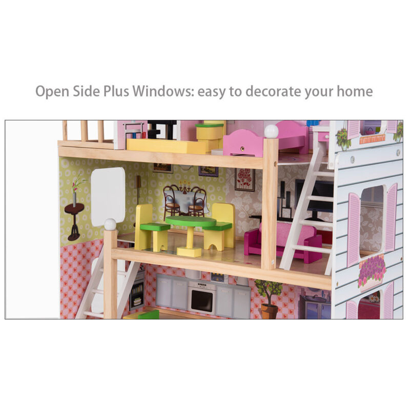 Wooden Kids 3 Storey Doll House With Furniture Accessories Mansion Playhouse Toy