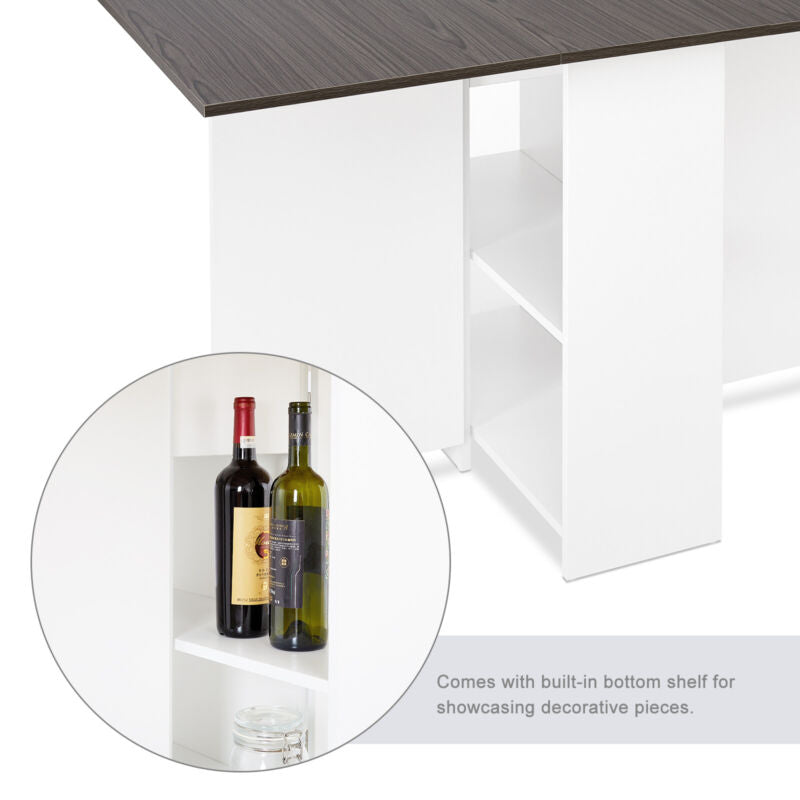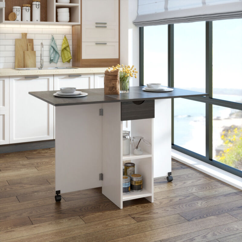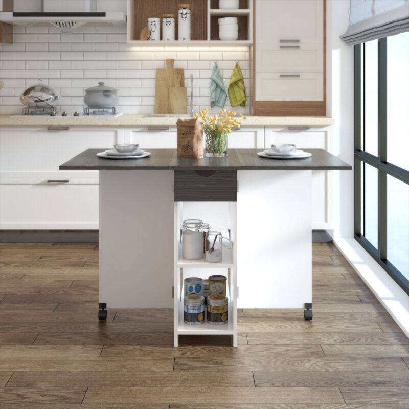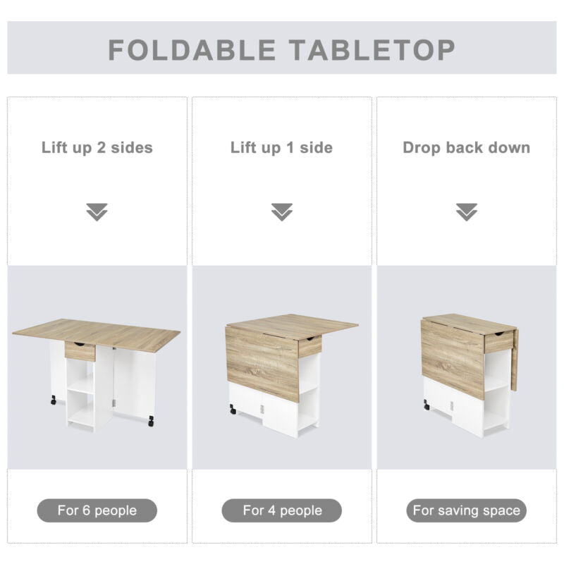 Wooden Mobile Drop Leaf Dining Table Folding Desk w/ 2 Wheels Storage Shelves