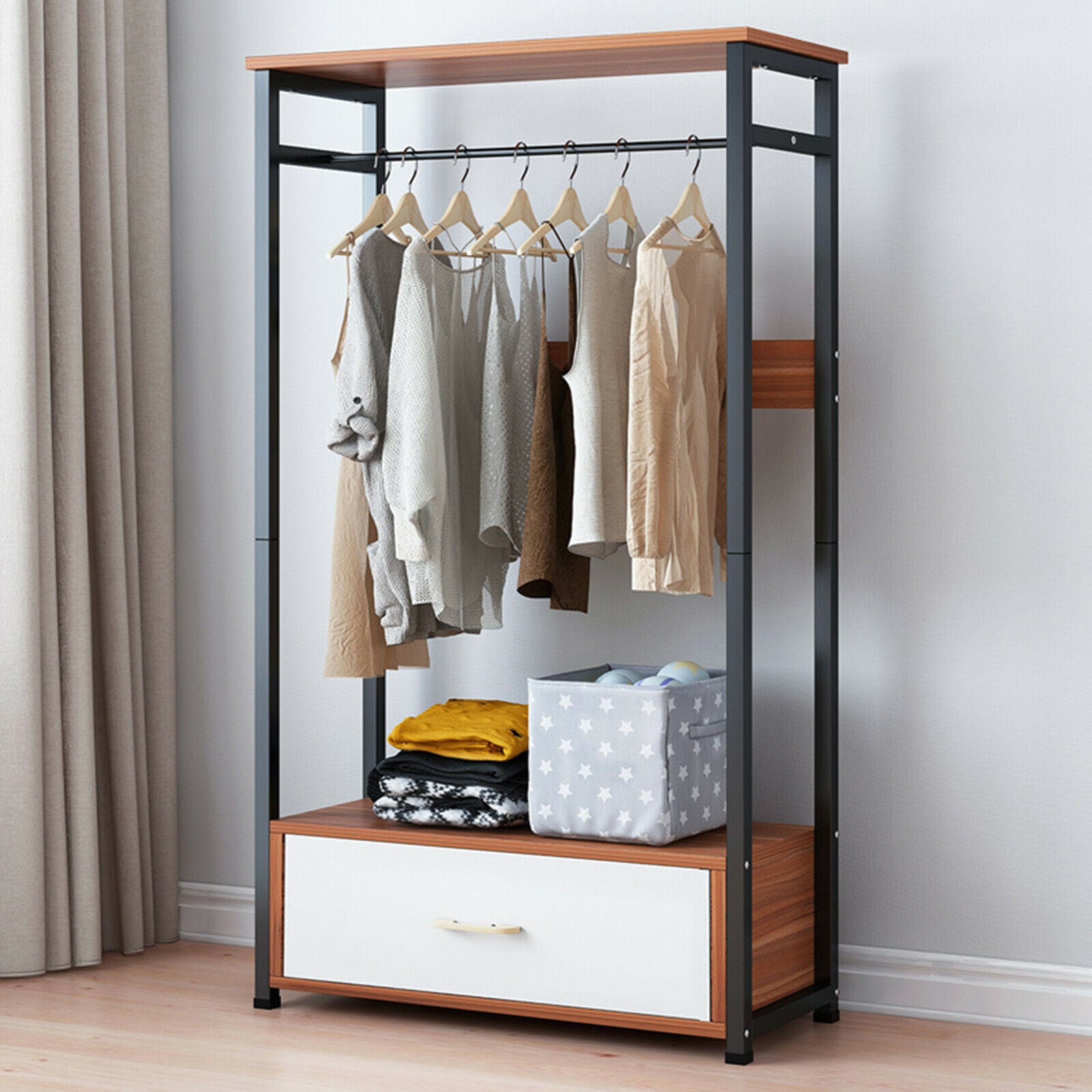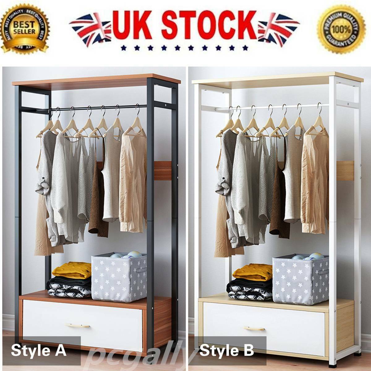 Wooden Open Wardrobe Closet Bedroom Storage Shelves Hanging Shelves & Drawer UK