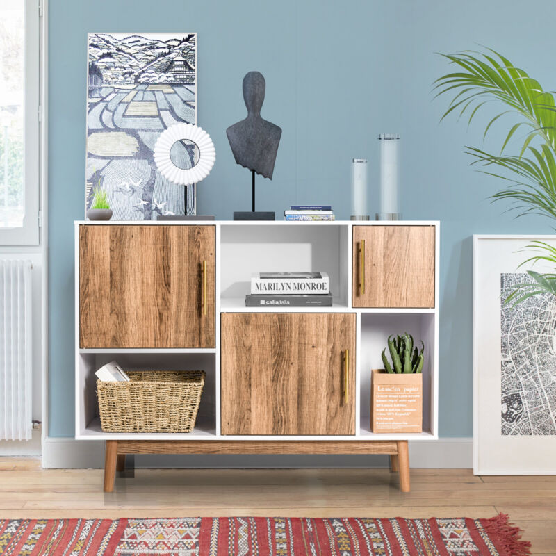 Wooden Storage Cabinet Floor Standing Bookcase Sideboard with Doors Open Shelves