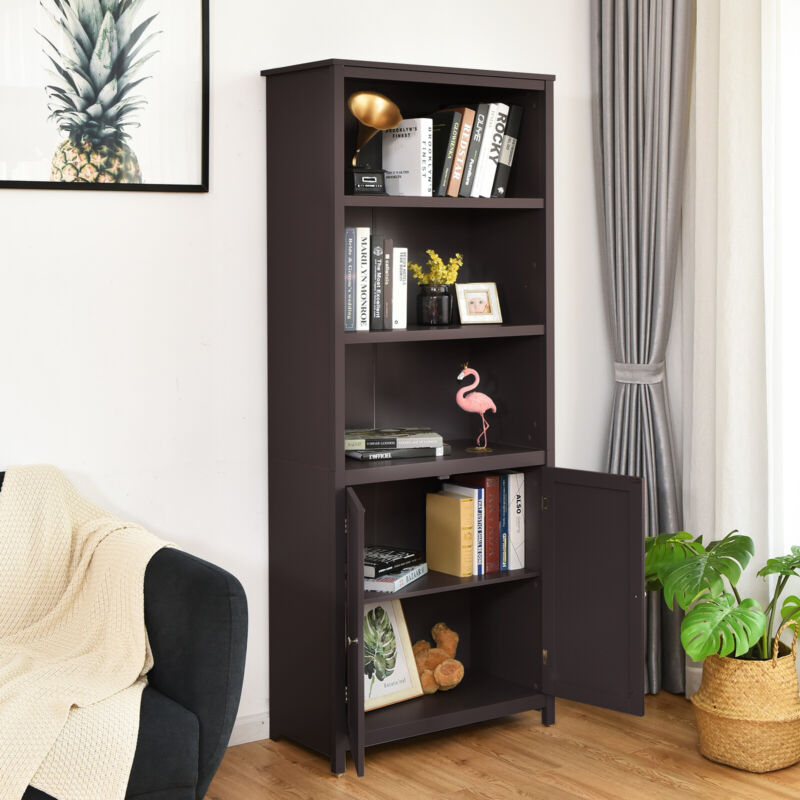 Wooden Tall Bookcase 3-Tier Shelving Storage Cabinet 2 Doors Display Organizer