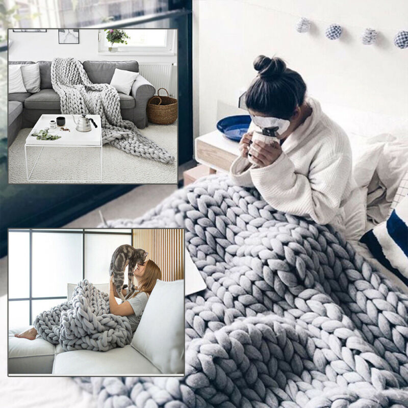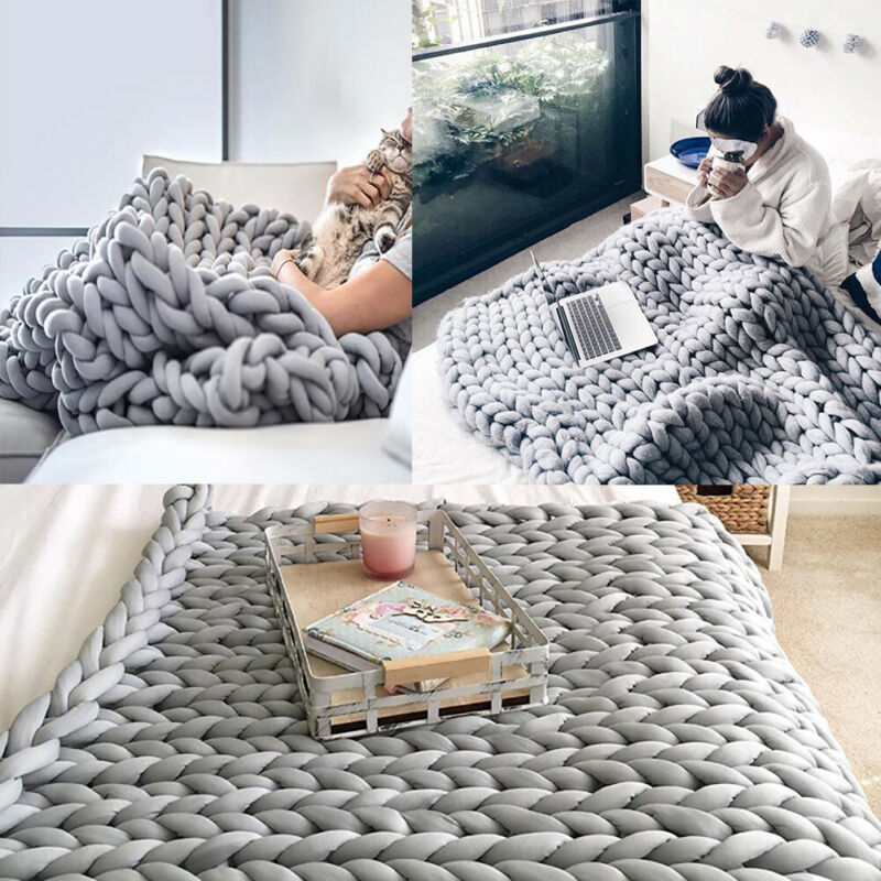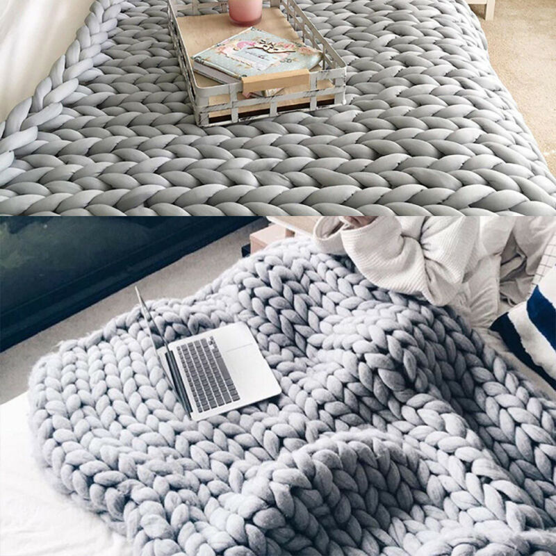 Wool Winter Warm Hand Woven Blanket Chunky Cable Knit Sofa Chair Blanket Grey